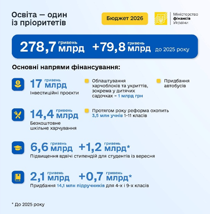 У Державному бюджеті України на 2026 рік передбачено 278,7 млрд грн на розвиток системи освіти. Це на 79,8 млрд грн більше ніж у 2025 році. Про це йдеться на сайті Міністерства фінансів України. Основні показники держбюджету-2026 на освіту: У наступному році розпочнеться реформа оплати праці освітян, зокрема з 1 січня 2026 року заробітна плата вчителів,